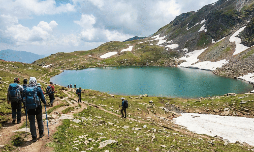 Start early for the 10 km trek to Bhrigu Lake at 14,100 ft, walking over alpine ridges and snow patches with panoramic views of Hanuman Tibba and the Pir Panjal range.